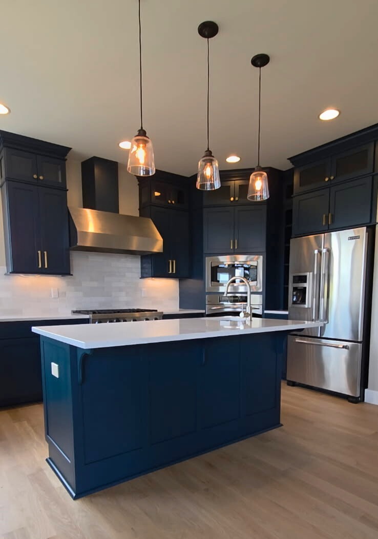 Soft blues, sages, olives, and muted greens continue to be popular, especially for kitchen islands, bathroom vanities, and accent cabinets. These colors bring just enough personality without feeling trendy or overpowering.